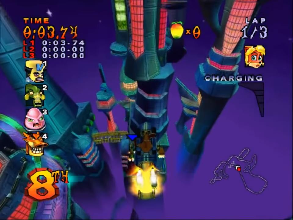 | Jogabilidade | 6 | A jogabilidade trouxe muitos elementos novos e interessantes, mas ficou bem defeituosa, os karts parecem travados na pista e as corridas não parecem tão emocionante como no CTR, apesar das pistas terem loopings e coisas do tipo. Além disso, o Team Frenzy, ao menos para mim, é totalmente desnecessário, já que os jogadores experientes preferem ir no Turbo Boost e esquecem completamente disso, deveriam ter pensado em algo melhor a respeito do Team Frenzy.” |