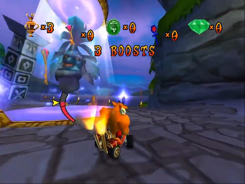 | Jogabilidade | 9.5 | “Alguns reclamam estar parecido com o CTR mas essa é a identidade dos jogos de Kart do Crash! Agora é mais fácil fazer os Boosts pois a barra aparece ao lado do kart e grande quando ele desliza; armas novas, as maneiras de trapacear e ganhar fácil utilizando a técnica dos boosts deixam-no muito legal! O problema é que algumas vezes o Kart trava no meio da pista, principalmente quando estás fazendo boosts e quando pulas para deslizar o Kart algumas vezes (raríssimo) o Kart atravessa a pista! É linda a visão (principalmente se você faz isso na “Out of Time”) porém te prejudica muito, pois demora a morrer.“ |